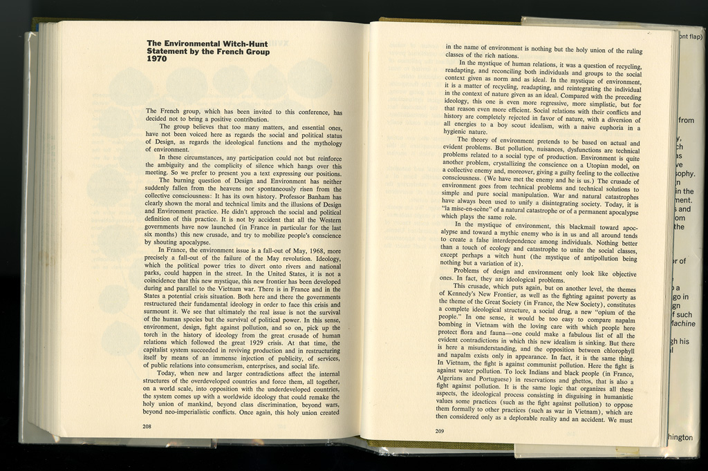Jean Baudrillard. “Statement Made by the French Group” (1970), 84-85, International Design Conference in Aspen Paper. Special Collections and University Archives Department, Richard J. Daley Library, University of Illinois at Chicago. Reprinted as “The Environmental Witch-Hunt: Statement by the French Group, 1970.” In The Aspen Papers: Twenty Years of Design Therory from the International Design Conference in Aspen, edited by Reyner Banham. 208-10. New-York: Praeger, 1974.